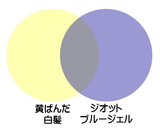 日本人の白髪は透明感のある真っ白ではなく、やや黄色がかった色になりがちです。ジオットブルージェルは、この黄ばみがかった白髪にブルーの補色を重ねることで、白髪を自然なグレーに整えることができます。