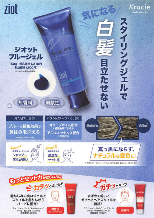 本日、仕上げに何か付けますか?ツヤ出しや整髪だけでなく、白髪を自然に目立たなくするブルージェルも似合うと思いますよ。