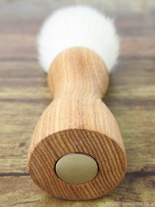 野球バットや北欧家具にも使われる軽くてしなやかな木材。明るい色合いと直線的な木目が清潔感を演出します。実際に手に取ると非常に軽く、長時間の作業でも疲れにくいのが魅力。女性理容師様や女性シェービングにおすすめです。全長109mm、毛の長さ49mm、毛軸直径20.4mm、毛量:約52,000本。木製柄には、防カビ・撥水加工が施されているため、水分や湿気による劣化を防ぎ、清潔に長くお使いいただけます。