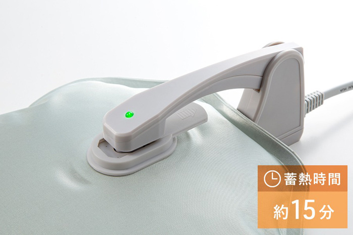 蓄熱時間は約15分ほどで満タンになり、グリーンのパイロットランプが消灯したら充電完了です。カイロとして使う場合で約4時間、お布団の中に入れてアンカとして使う場合で約8時間連続使用可能となっています。