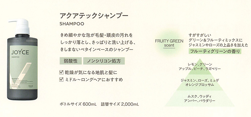 理美容師の手肌の負担を少しでも軽くしたい──。そんな現場の声から開発が進められてきたのが、新しい業務用ヘアケア《JOYCE アクアテックシリーズ》です。長時間のシャンプーワークによる手荒れ・乾燥の軽減と、使いやすさ・仕上がりの再現性を軸に“技術者ファースト”で設計されています。シリーズ最大の特徴は、技術者の手肌やお客様の髪質に合わせて選べる2種類の洗浄ベースです。