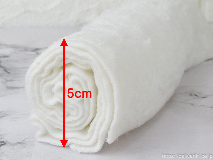 タオルの厚みが増したぶん、絞る際の手応えは旧モデルより強くなっています。ただし、濡れた状態で丸めた直径は実測約5cm だったので、一般的な320匁蒸しタオルよりは小さく、拭き取りタオルとして扱いやすい範囲だと思われます。また、レーヨンタオルは使用を続けると薄くなりやすいため、長期間使用したお手元の”旧モデル”と比較すると、新モデルがより厚く感じられることでしょう。
