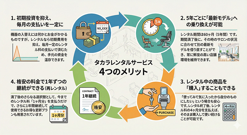レンタル期間は60ヶ月(5年間)です。期間満了後に、その時のサロンの状況に合わせて別の最新モデルを借り直すことができ、常に鮮度の高い店舗環境を維持できます。
