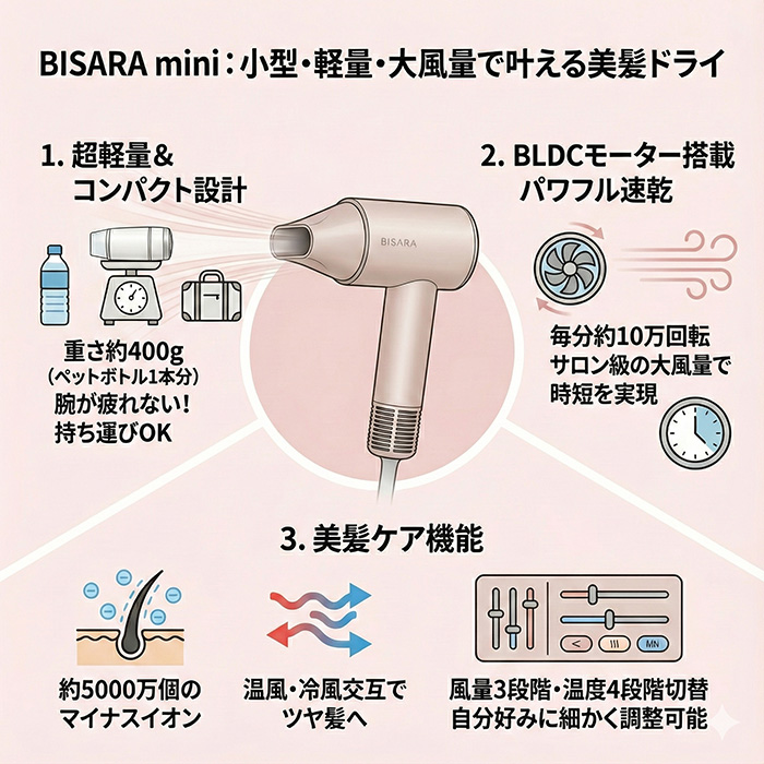 といったご相談をお客様からいただくことはありませんか?実は、毎朝・毎晩のドライヤーにお悩みを感じている方は非常に多いんです。今回ご紹介するのは、そんなお悩みを一気に解消してくれる最新ヘアドライヤー『BISARA mini(ビサラ ミニ)』です。ぜひ、このブログ記事をご覧になり、お客様へのドライヤーオススメにお役立てください。