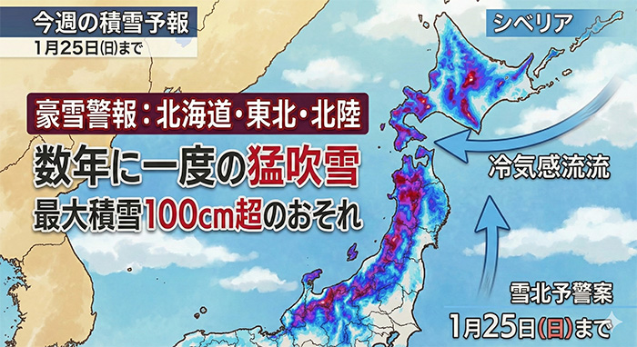ニュースでは「今季最強、そして今季最長の寒波」が報じられています。2026年1月25日(日)頃まで強い寒気が居座る見通しで、日本海側だけでなく太平洋側の地域でも厳しい冷え込みが予想されています。