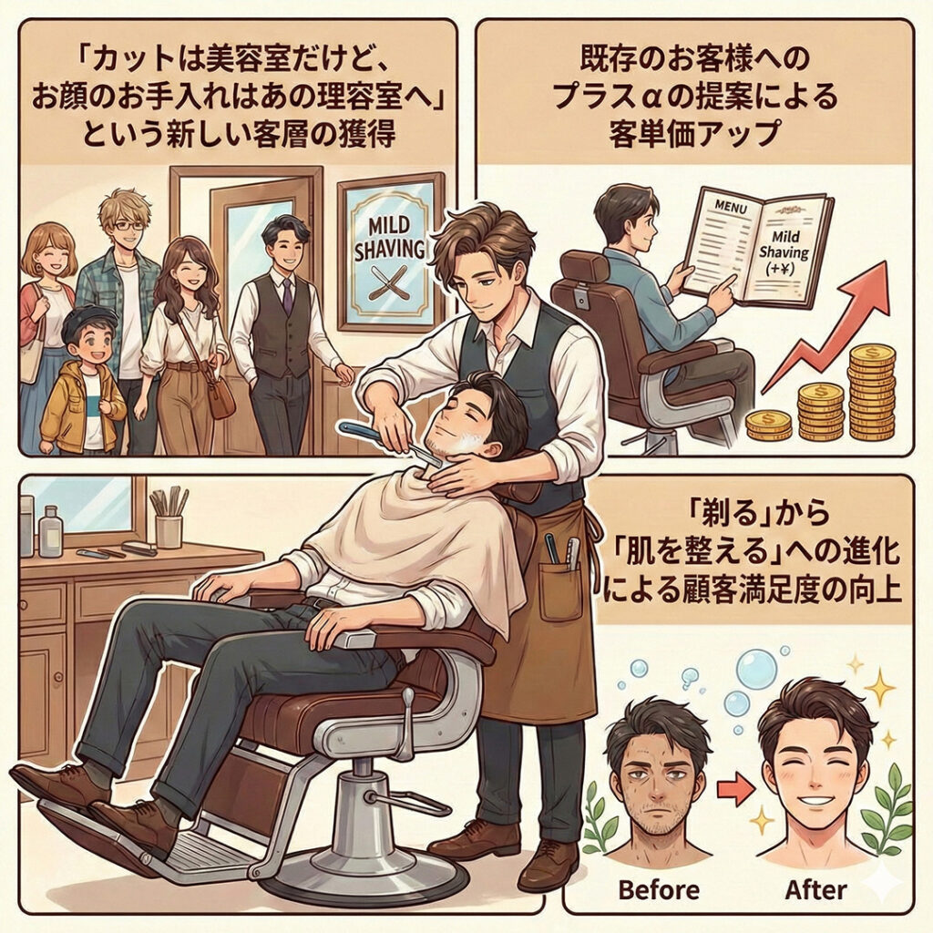今、メンズ美容の意識はかつてないほど高まっています。普段は美容室でカットしている男性の中にも、「実は顔のケアもちゃんとしてみたい」と感じている方は大勢いらっしゃいます。美容室では決して提供できない「シェービング」という独自の強みに、マイルドシェービングという「スキンケアの付加価値」を乗せること。