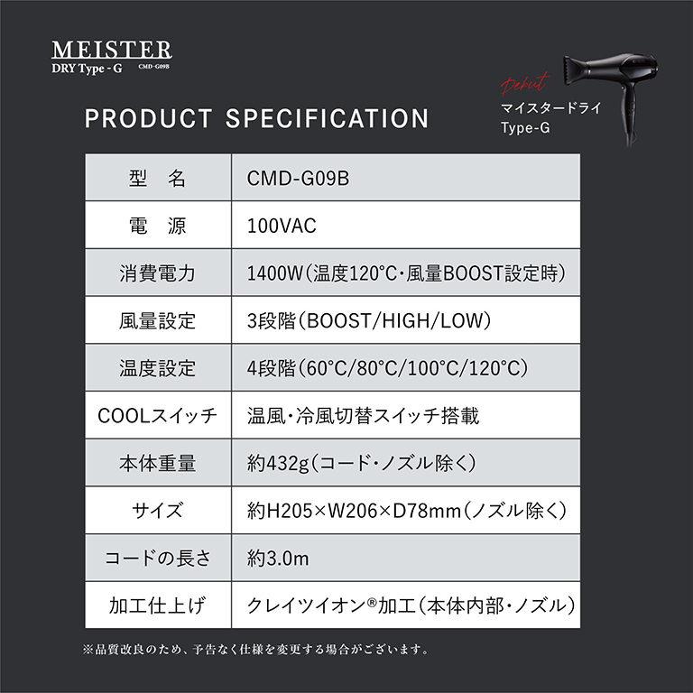 クレイツマイスタードライType-Gは、派手な機能訴求よりも、現場での使いやすさと結果を重視して設計されています。