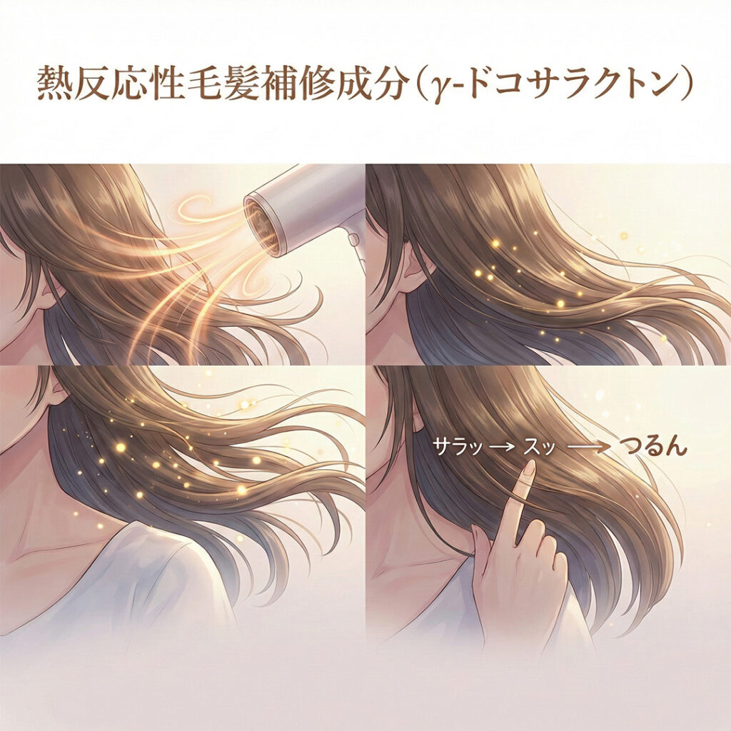その秘密のカギを握るのが、配合されている「熱反応性毛髪補修成分(γ-ドコサラクトン)」です。この成分は、ドライヤーやアイロンの熱が加わることで初めて活性化し、髪の表面だけでなく内部のタンパク質と結合するという特殊な性質を持っています。具体的には、熱の力を借りて以下のようなプロセスで髪を補修します。