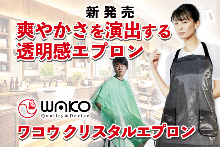 サロンワークを支える道具は、目立たない存在でありながら、日々の快適さを大きく左右します。長年サロンで使われてきた素材だからこそ、安心してお使いいただける。ワコウ クリスタルエプロンは、 現場で培われた素材の信頼性をそのまま形にした一着です。ぜひご検討ください。