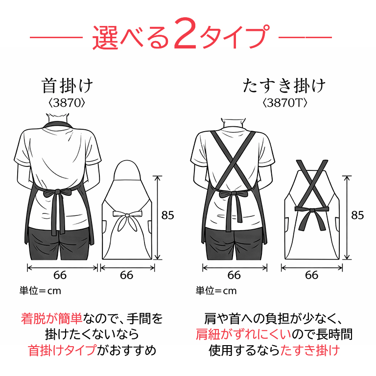 たすき掛けタイプは肩や首への負担が少なく肩ひもがズレにくいので、カラー施術が多く長時間使用される方におすすめ。デメリットは慣れるまで着脱時にひと手間かかる場合やサイズ調整が難しいといったことも。