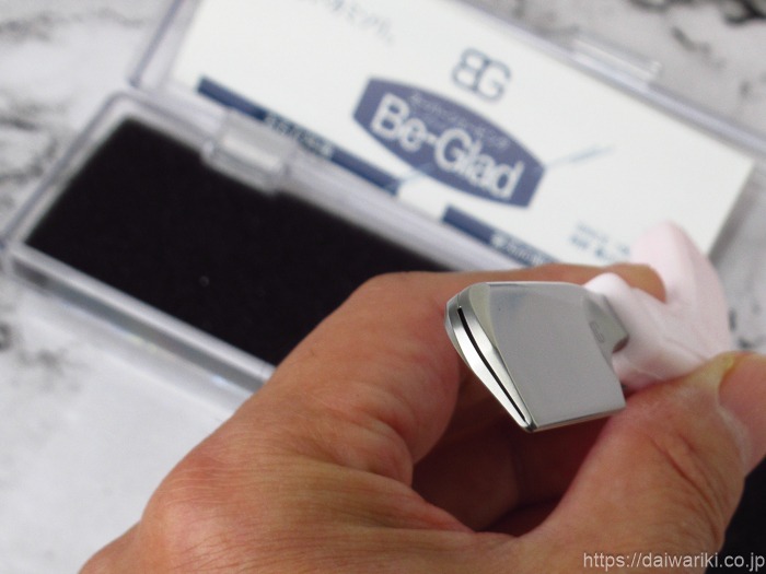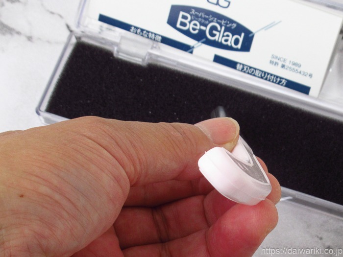一般的な女性用カミソリは小型軽量なものが多い中、ビーグラッド(日本刀型)は実測で約51gと、カミソリの中ではかなり重めの部類に入ります。しかし、この「重さ」こそが最大のメリットです。厚さわずか0.02mmという繊細な女性の角質に対し、手や指で押し当てるのではなく、ホルダー自体の重みを利用することで、お肌に負担をかけない理想的な圧力での走行を可能にしています。