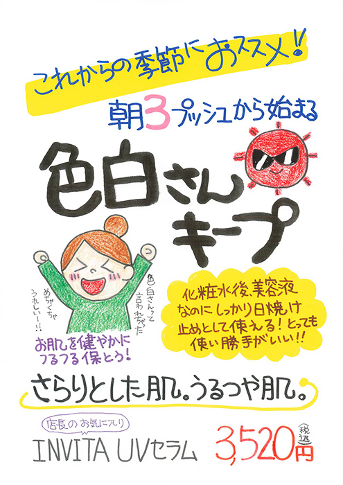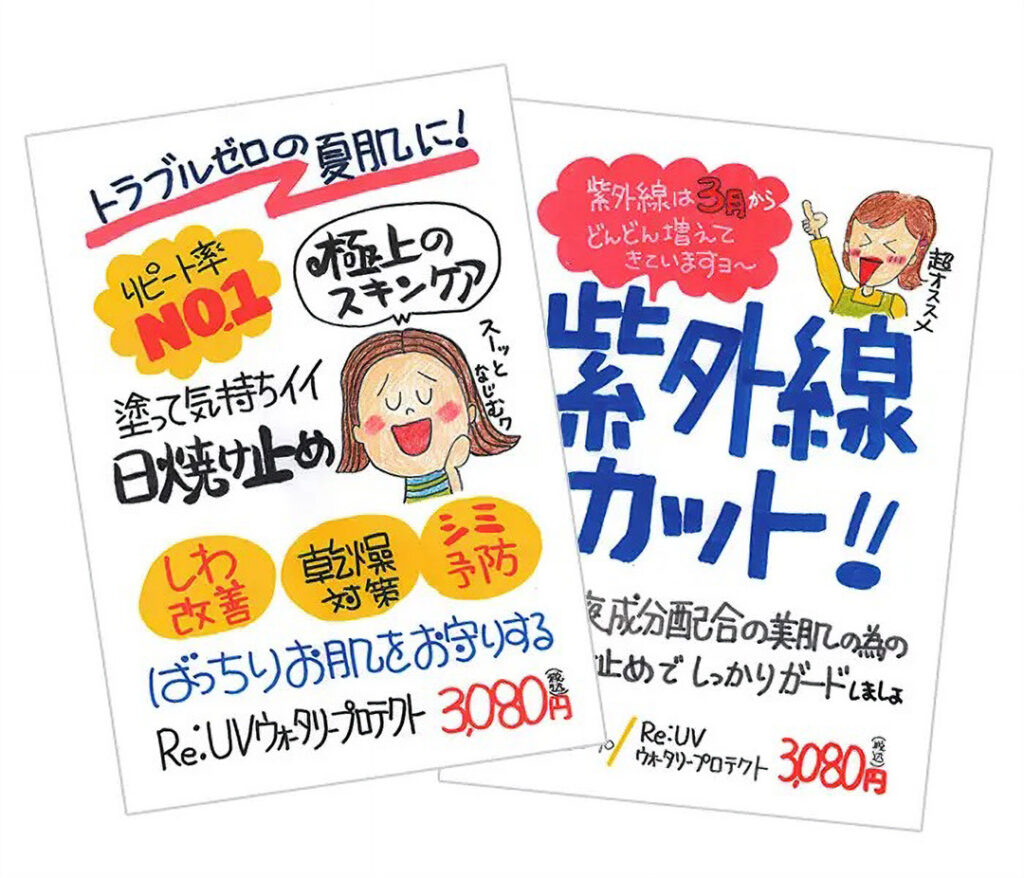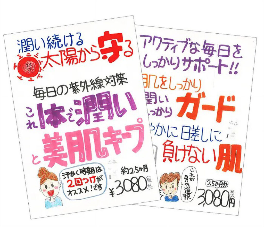 • 手書き風POP: 店内に掲示するだけで、商品の魅力がお客様にダイレクトに伝わります。今回は「リアル UV ウォータリープロテクト」用に4種類、「インヴィータ UV セラム」用に1種類をご用意し、ご希望のサロン様へプレゼントいたします。