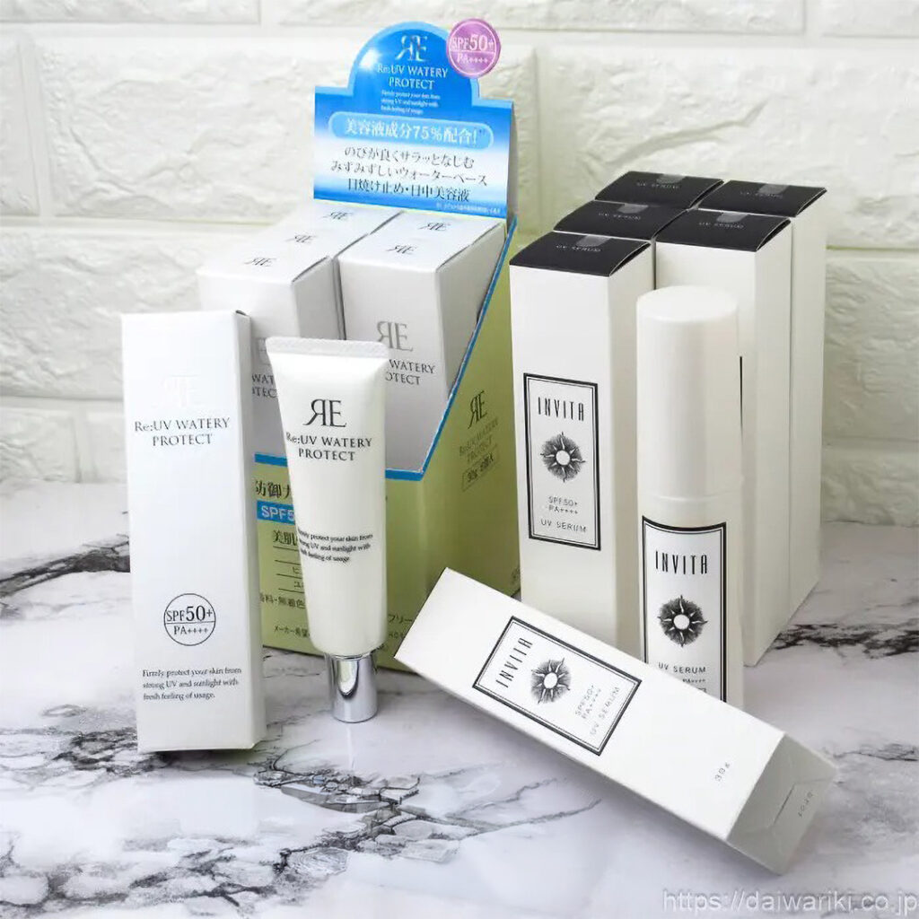 今回のセットは、「リアル UV ウォータリープロテクト」と「インヴィータ UV セラム」のミックス注文も可能です。必需品のウォータリープロテクトを中心に、こだわり派の方に向けたインヴィータを数本組み合わせるなど、柔軟に対応いたしますのでお気軽にご相談ください。